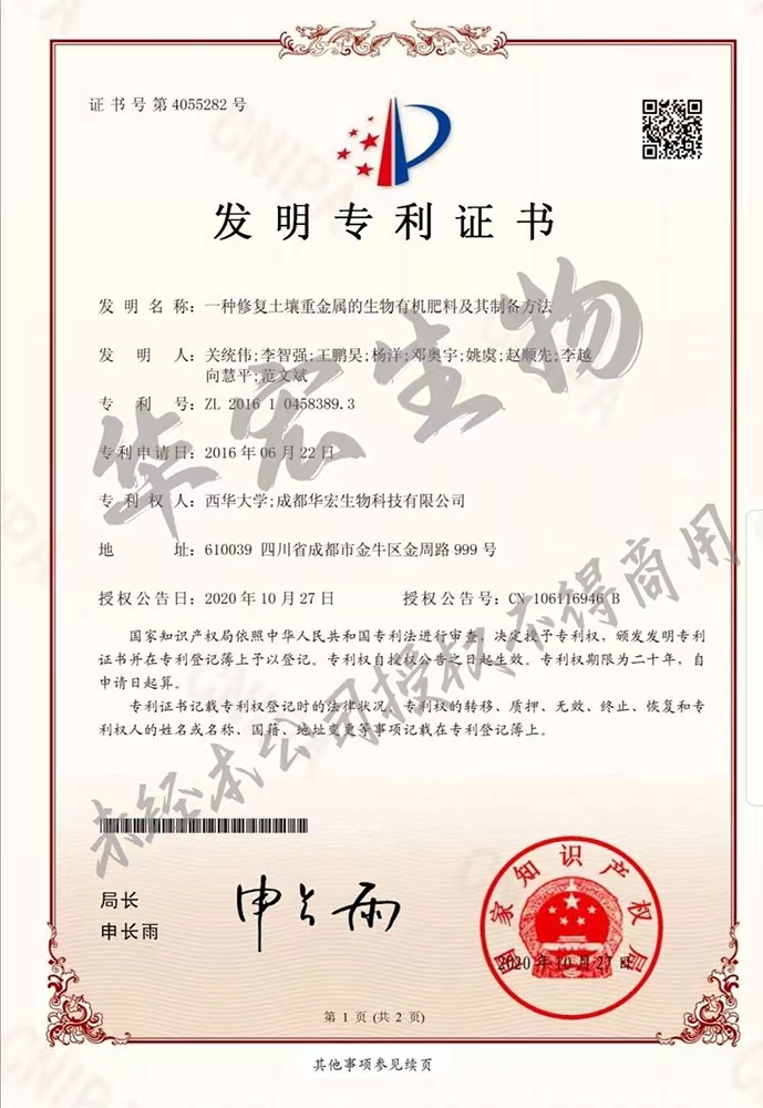 一種修復土壤重金屬的生物有機肥料及其制備方法專利證書